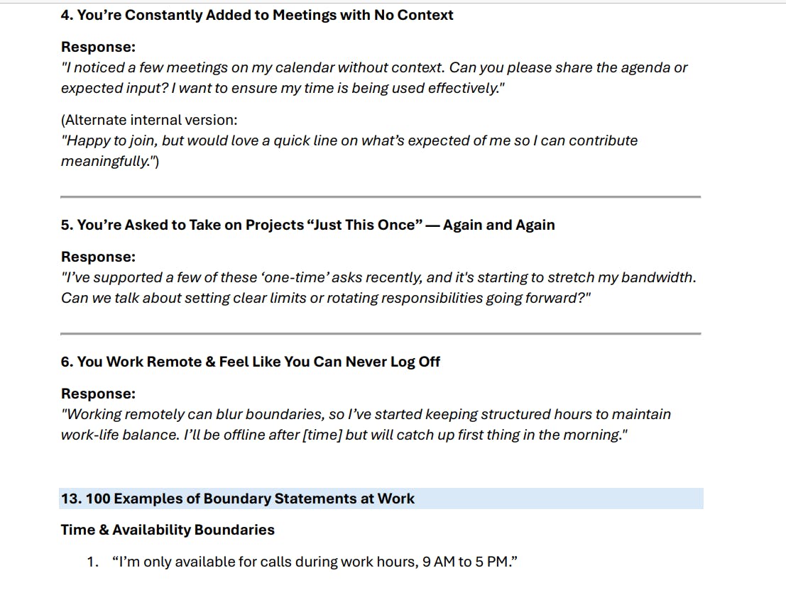 Inside, you'll find scripts, templates, reflection prompts, and real-world examples to help you speak up without second-guessing, say “no” without guilt, and finally draw the line between work and life — without burning bridges.